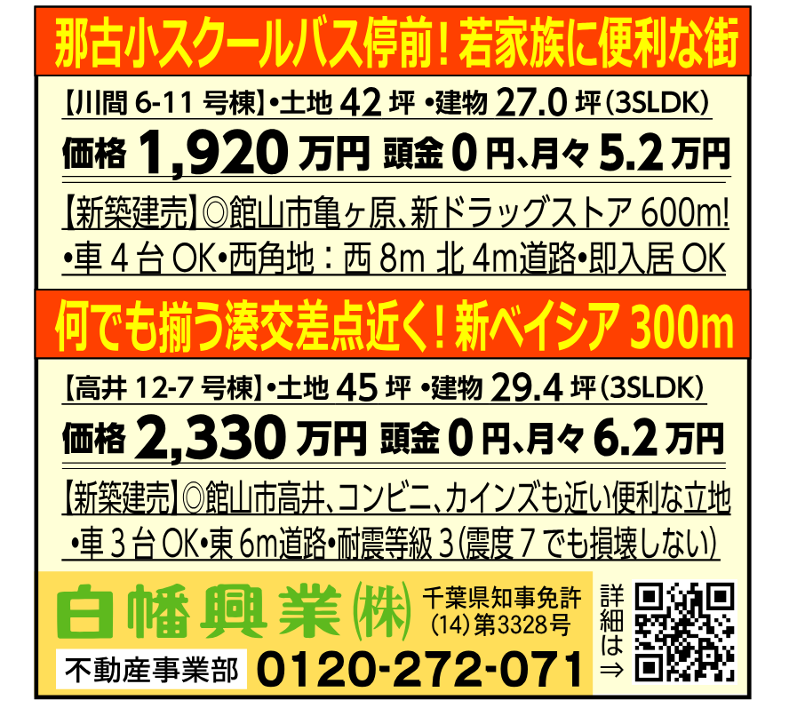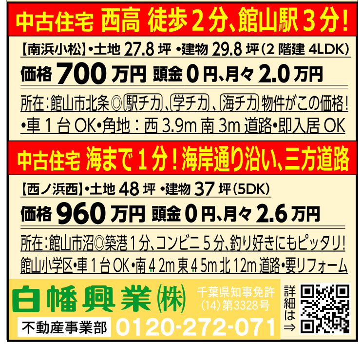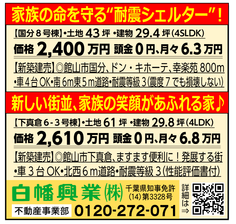 館山へお帰りなさい!住むにはやっぱり地元が一番!!物件探しは今がチャンス!相談多数あり!お気軽にお電話ください♪℡0120-272-071 不動産部まで