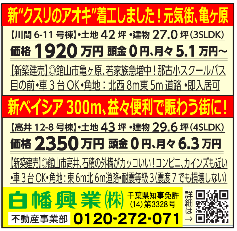 館山市、南房総市の完成物件が勢ぞろい♪鴨川もこれから着工します。未公開物件、中古等多数扱っています。詳しくはお電話またはメールでお問い合わせ可能です♪℡:0470-27-2001mail:fudosan@sirahata.co.jp